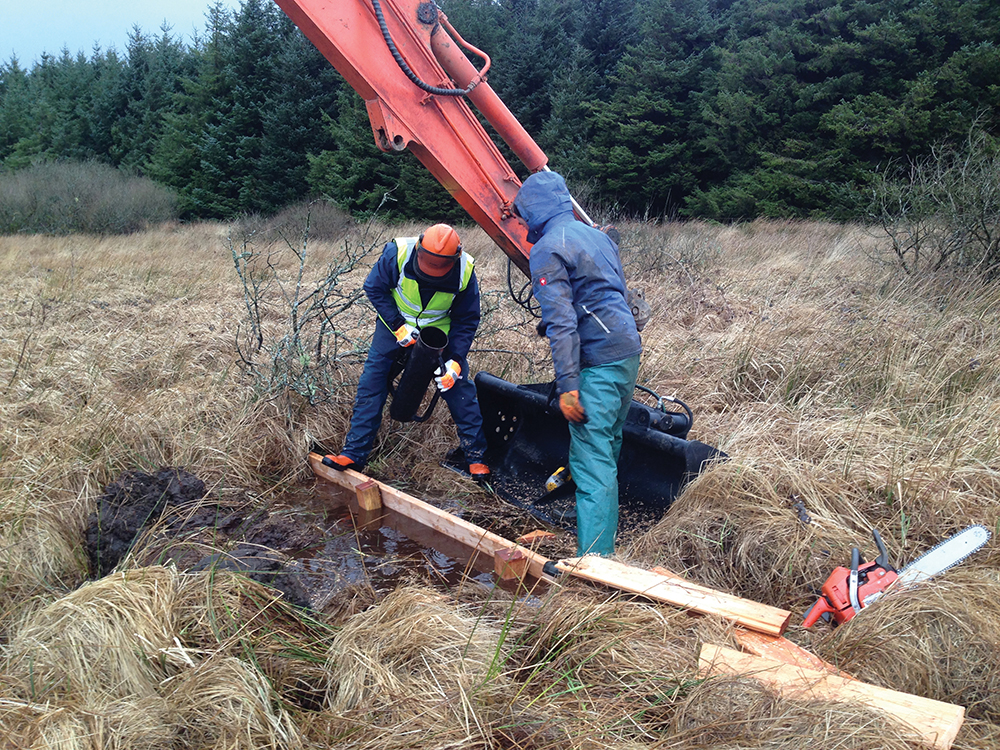 Various ditch blocking techniques using sustainable materials (wood, peat, grass and heather) will be adopted on historic peat cuttings, drainage networks and eroding gullies in order to enable re-wetting of extensive areas of damaged peatlands.