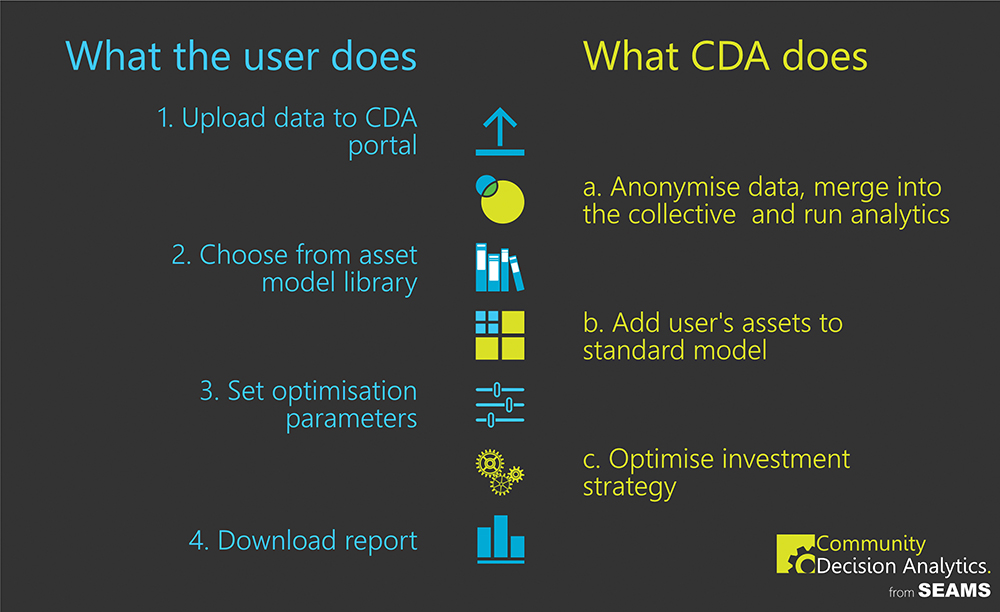 Community Decision Analytics (CDA) requires subscribers to upload their data into a group data store. The data is anonymised on the way into the collective database, but you can continue to access your own individual organisation’s data in its original form. This overcomes the issue of having insufficient data to perform analytics, and also reduces costs, as you no longer have a need to increase data collection efforts.