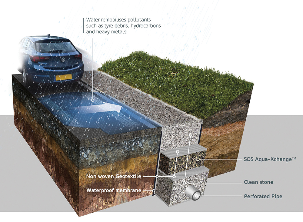 “When a risk assessment, conducted according to Highways England’s Design Manual for Roads & Bridges, identifies unacceptably high levels of soluble copper and zinc, then action must be taken to treat the pollution. In a situation like this, SDS Aqua-XchangeTM comes into its own, because it gives designers unprecedented flexibility to add the material to a range of SuDS components and boost their treatment performance.