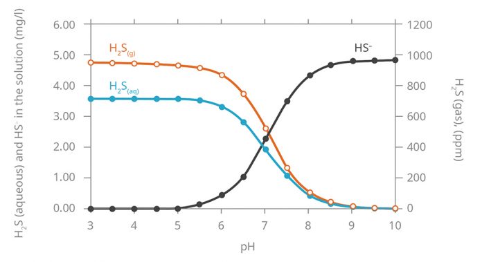 As can be seen at the pH of 8.5, the release of gaseous H2S drops almost to zero. If there is no release of hydrogen sulfide into the gas phase, then there is no biochemical corrosion of the sewage system.