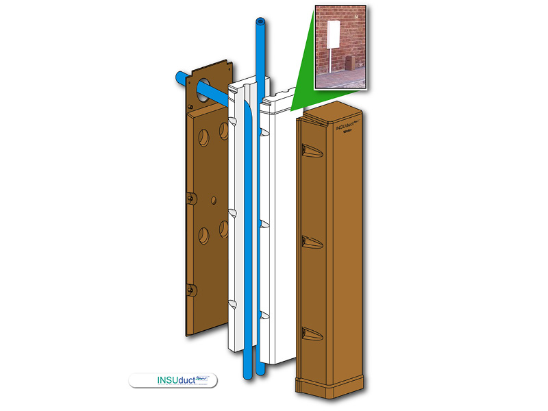 INSUduct is carefully fabricated to provide long lasting and effective thermal protection to water pipes and fittings outside the thermal envelope of a building. There is little impact on the exterior appearance of the property, as the INSUduct system provides a neat, clean finish to the job. This method of wate supply replacement also allow multiple supply pipes to be installed in multi-occupancy properties, as it is designed to provide frost protection for up to three 32mm OD water pipes installed to the exterior of the building.